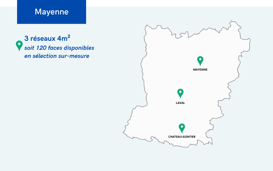 Notre réseau d'affichage Péri 4 Mayenne propose 36 panneaux au format 4m² pour couvrir les communes de l'agglomération mayennaise, incluant Gorron, Ernée, et bien évidemment la commune de Mayenne et son agglomération. Ce réseau d’affichage est disponible en sur-mesure pour vous permettre de toucher efficacement votre public cible dans cette charmante ville de la Mayenne, grâce aux conseils de nos experts.