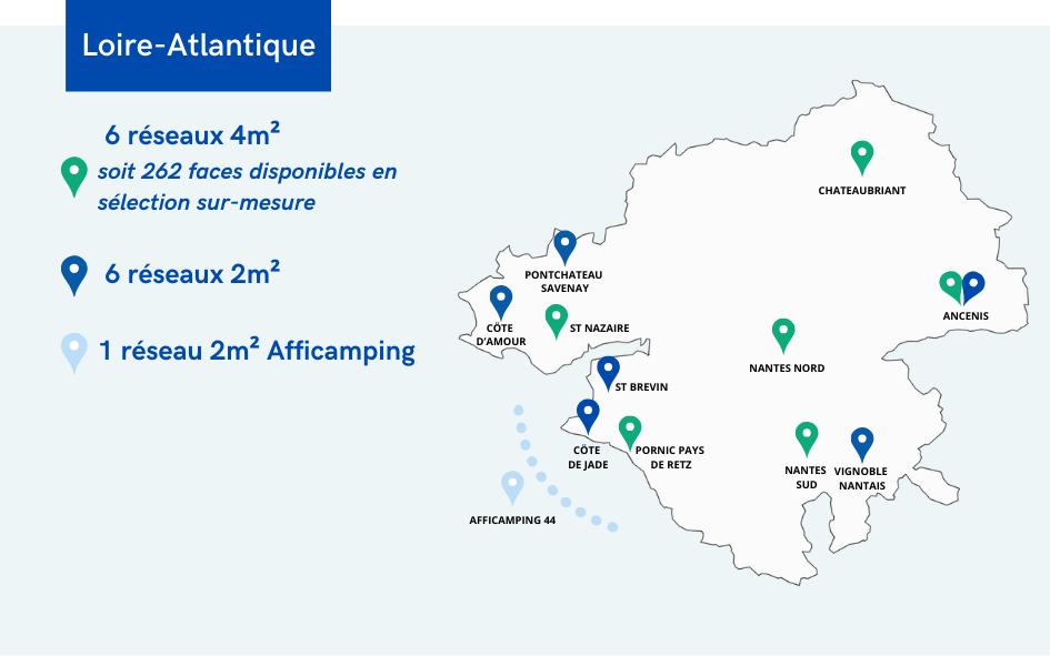 Vacances d’été en bord de mer ? Week-end à la Baule ? Simple envie de farniente ? La côte Atlantique vous ouvre ses portes de pleine vague. D’avril à septembre, nous proposons un réseau d'affichage Afficamping 44 de 21 panneaux 2m² présent dans les campings de la côte Atlantique de Pornic à la Turballe, en passant par Le Croisic, La Baule-Escoublac, Pornichet, et bien d’autres encore. De quoi animer la saison estivale des ligériens et des touristes.