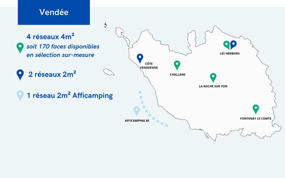 Notre réseau d'affichage Afficamping 85 de 20 panneaux 2m² est présent dans les campings tout au long de la côte, de La Barre-de-Monts à La Tranche-sur-Mer, en passant par Saint-Hilaire-de-Riez et Les Sables-d'Olonne.